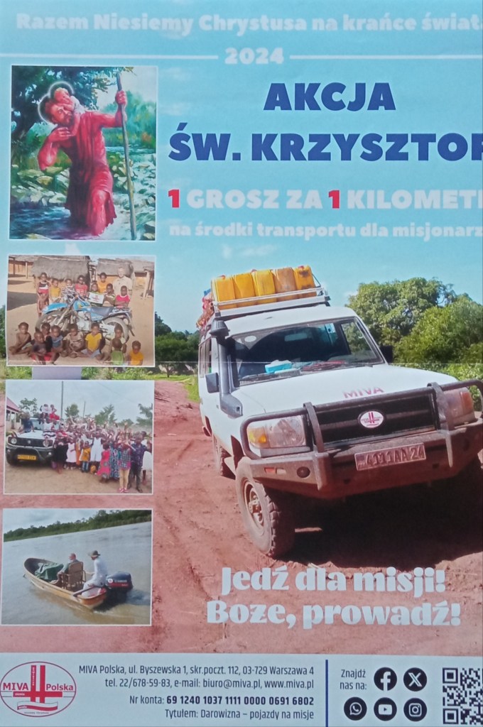 W niedzielę 27 lipca 2025 r. po Mszach Świętych pobłogosławimy pojazdy i ich użytkowników z racji na przypadające 25 lipca wspomnienie Świętego Krzysztofa, patrona kierowców i podróżujących. Zachęcam do udziału w misyjnej akcji Św. Krzysztofa – 1 grosz za 1 kilometr szczęśliwej jazdy. Radę Parafialną i Zespół Charytatywny prosimy o przeprowadzenie zbiórki. Zebrane ofiary będą przeznaczone na środki transportu dla misjonarzy.