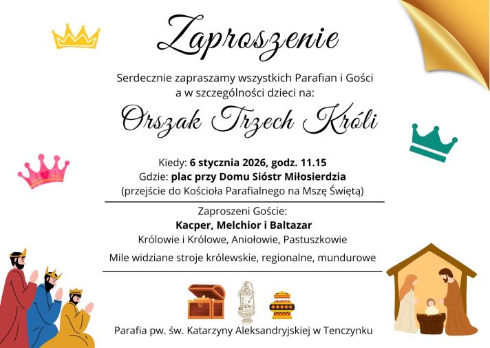 Serdecznie zapraszamy wszystkich Parafian i Gości, a w szczególności dzieci na ORSZAK TRZECH KRÓLI. Przejdziemy uroczyście z Domu Sióstr Miłosierdzia do Kościoła Parafialnego i pokłonimy się Dzieciątku Jezus leżącemu w żłóbku.