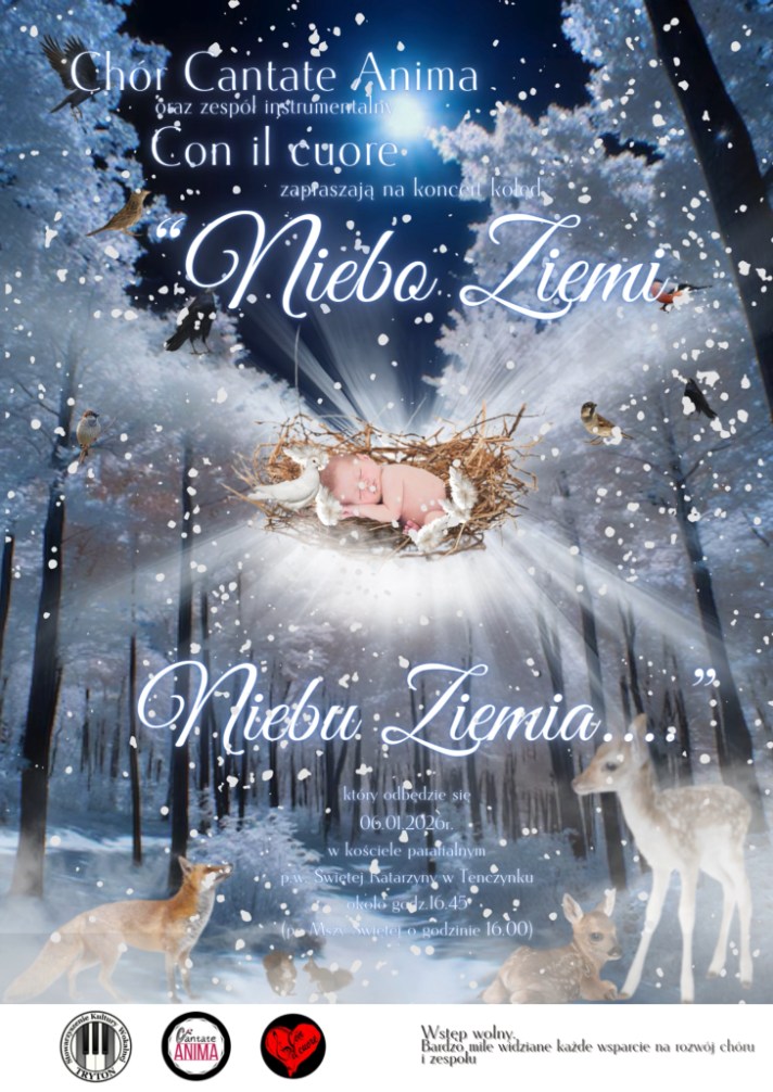 Bardzo serdecznie zapraszamy na koncert kolęd i pastorałek „Niebo ziemi – niebu ziemia…” w wykonaniu chóru Cantate Anima oraz zespołu Con il cuore. Koncert odbędzie się w naszym kościele w święto Trzech Króli, 6 stycznia o godzinie 16.45. Zachęcamy do dzielenia się radością z narodzenia Bożego Dziecięcia poprzez muzykę i wspólny śpiew.