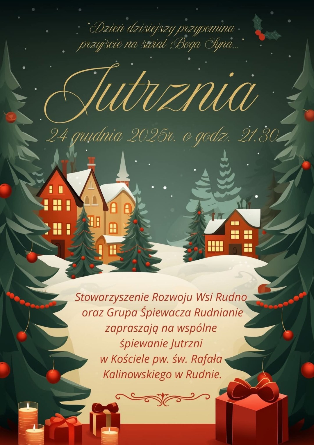 Razem ze Stowarzyszeniem Rozwoju Wsi Rudno oraz Grupą Śpiewaczą Rudnianie zapraszamy na wspólne śpiewanie Jutrzni 24 grudnia 2025 roku o godz. 21.30 w kościele w Rudnie.