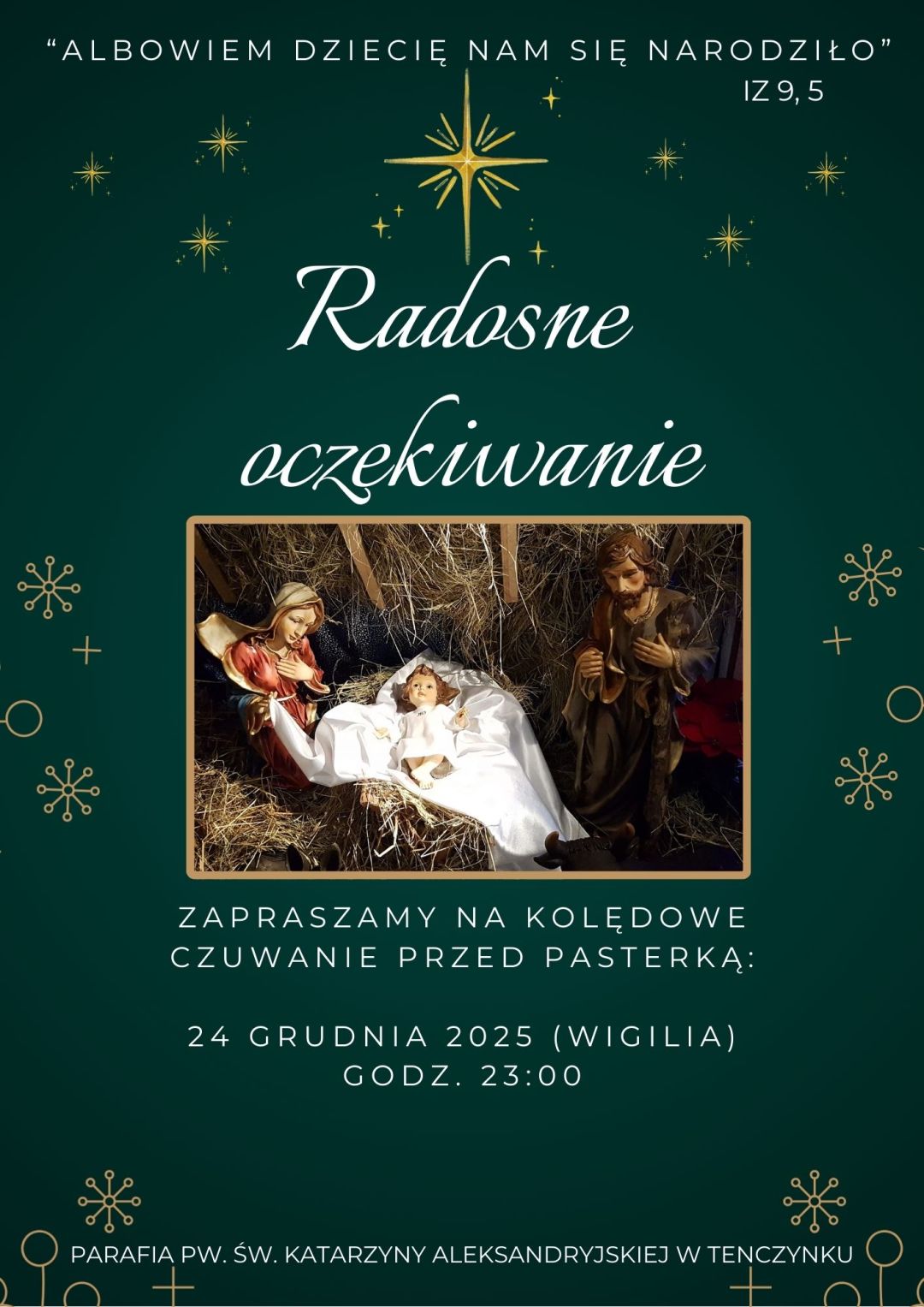 "Albowiem dziecię nam się narodziło!" Trwajmy w radosnym oczekiwaniu na Narodziny Pana Jezusa. Zapraszamy serdecznie wszystkich Parafian i Gości na wspólne kolędowanie 24 grudnia 2025 w Wigilię Bożego Narodzenia o godz. 23:00 (bezpośrednio przed Pasterką).